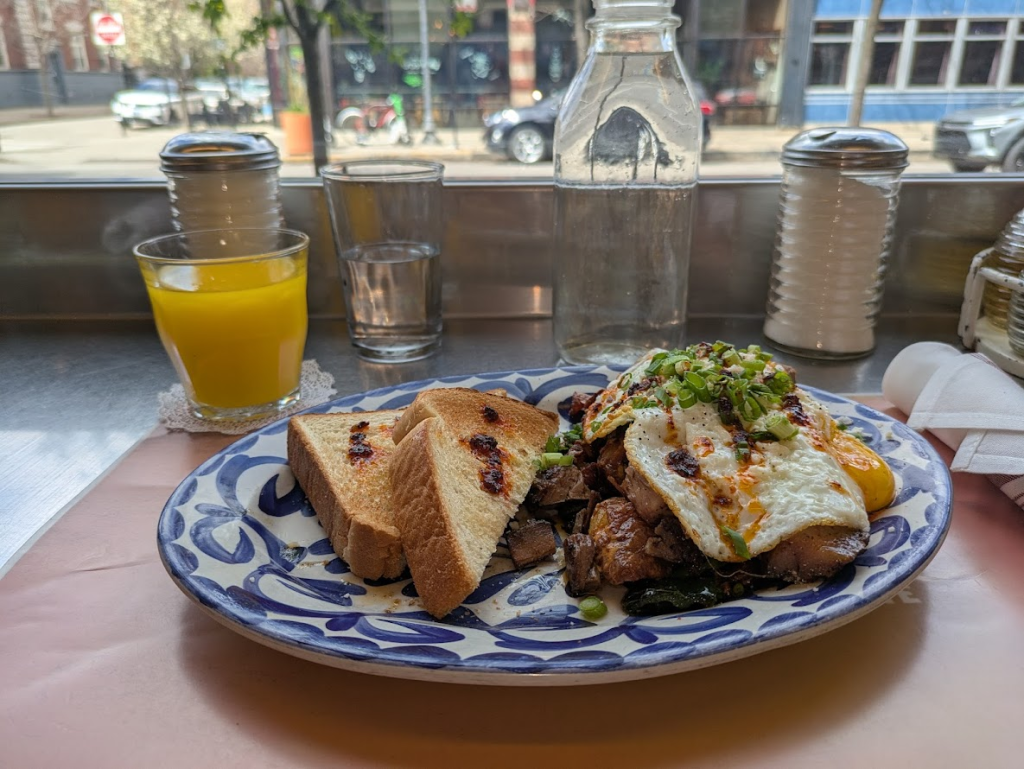 I went for an OJ and the brisket hash – crispy potatoes, brisket burnt ends, local mushrooms, chipotle aioli, queso fresco, scallion, peppers, two eggs, Texas toast – which danced across my palate as the Pulp Fiction soundtrack played throughout the room.